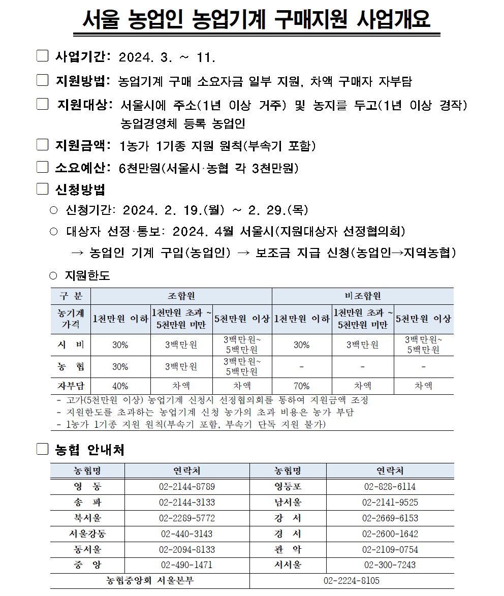 서울시 농업인 농기계 구입비 지원금은 서울시와 농협중앙회 서울본부가 절반씩 부담하기 때문에 조합원이 아닌 경우에는 서울시 지원금만 받을 수 있으며 농가당 1기종만(부속기 포함) 지원받을 수 있습니다.