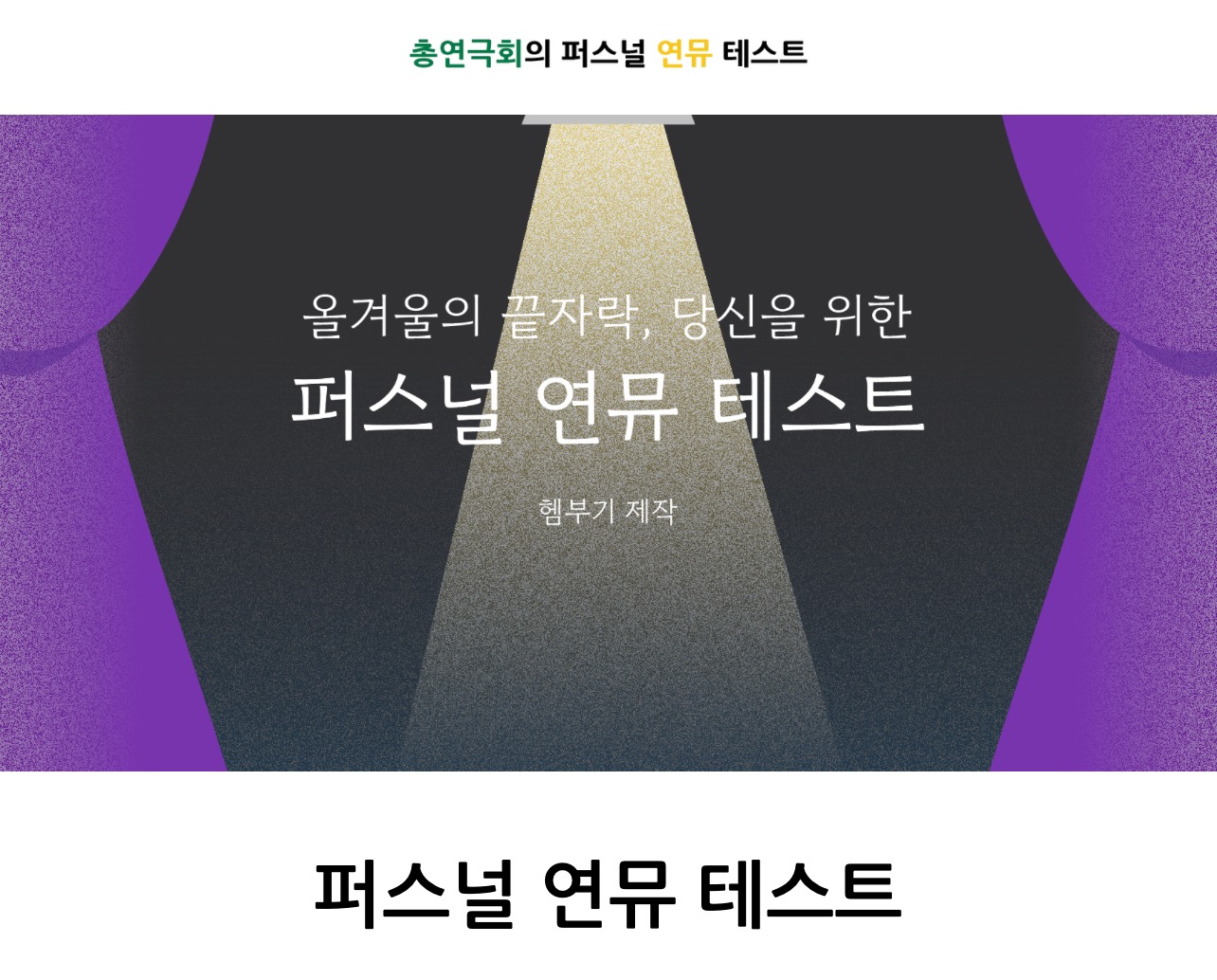 퍼스널 연뮤 테스트에 대해서 정리해보겠습니다. 연극과 뮤지컬 종류는 주제가 정말 다양하게 많은데 이번 포스팅에서는 나에게 맞는 연극과 뮤지컬을 추천해주는 ‘퍼스널 연뮤 테스트’를 소개드리겠습니다