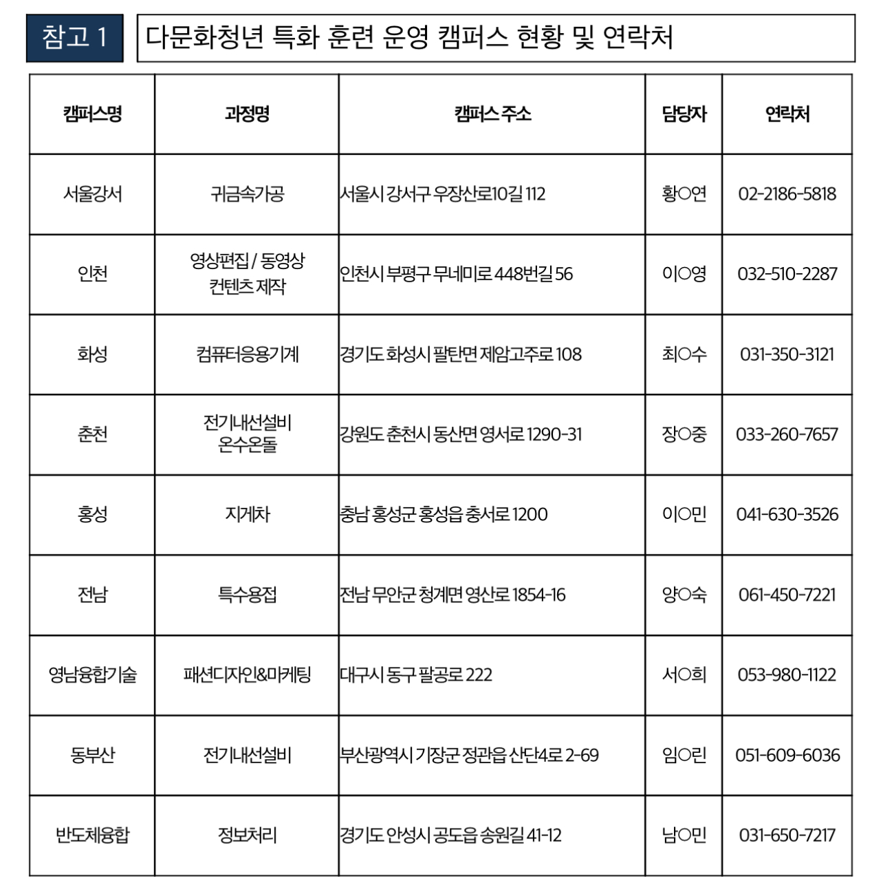 다문화 청년 특화교육 모집에 관해서는 캠퍼스별 담당자에게 문의하면 보다 상세한 정보를 제공받을 수 있습니다.