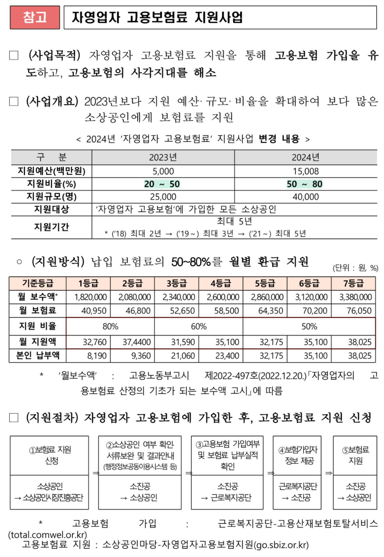동 사업은 고용보험에 가입한 소상공인(사업주)에게 보험료의 일부를 최대 5년간 지원하여 고용보험 가입에 따른 보험료 부담을 덜어주는 정책으로 지원비율이 2023년 20%~50%에서 2024년 50%~80%까지 확대됐고 지원규모도 2만 5천명에서 4만명으로 대폭 증가했다고 합니다.