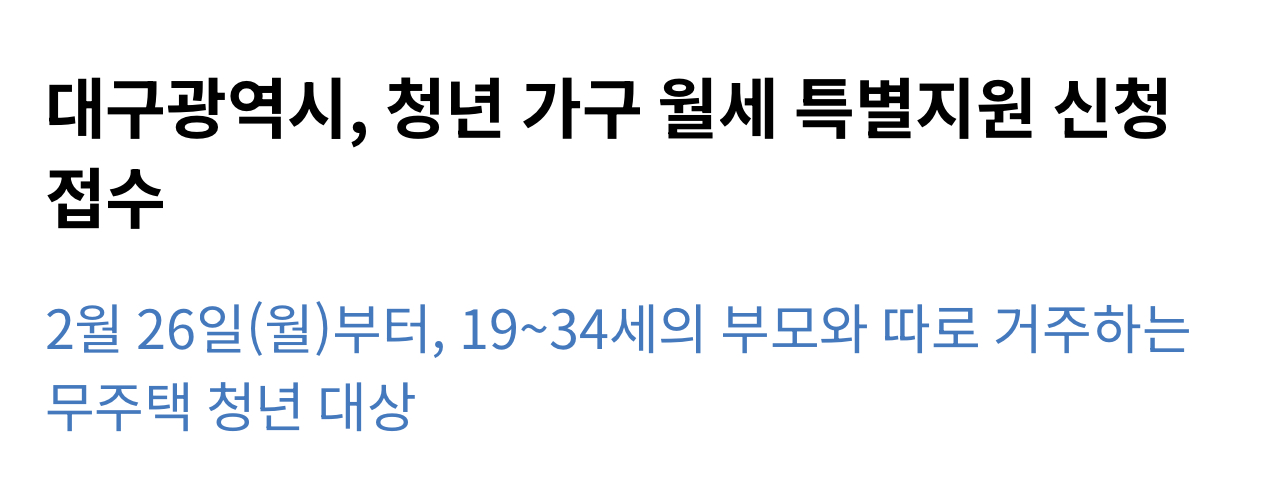 대구 청년월세지원 대상은 부모에게서 독립한 19~34세의 무주택 청년으로, 보증금 5천만 원 이하, 월세 70만 원 이하(보증금 월세 환산액과 월세액 합산 90만 원 이하)인 주택에 거주하고 청약저축에 가입한 이를 대상으로 한다고 합니다.