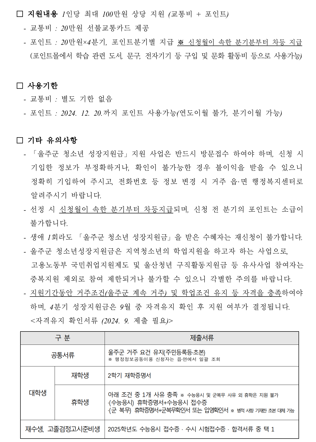 2024년 울주군 청소년 성장지원금 신청방법과 사용처에 대해서 정리하겠습니다. 울산시 울주군이 지역청소년의 건전한 성장과 학업 지원을 위해 ‘2024년 청소년성장지원금 지원사업’을 시행한다고 밝혔습니다.