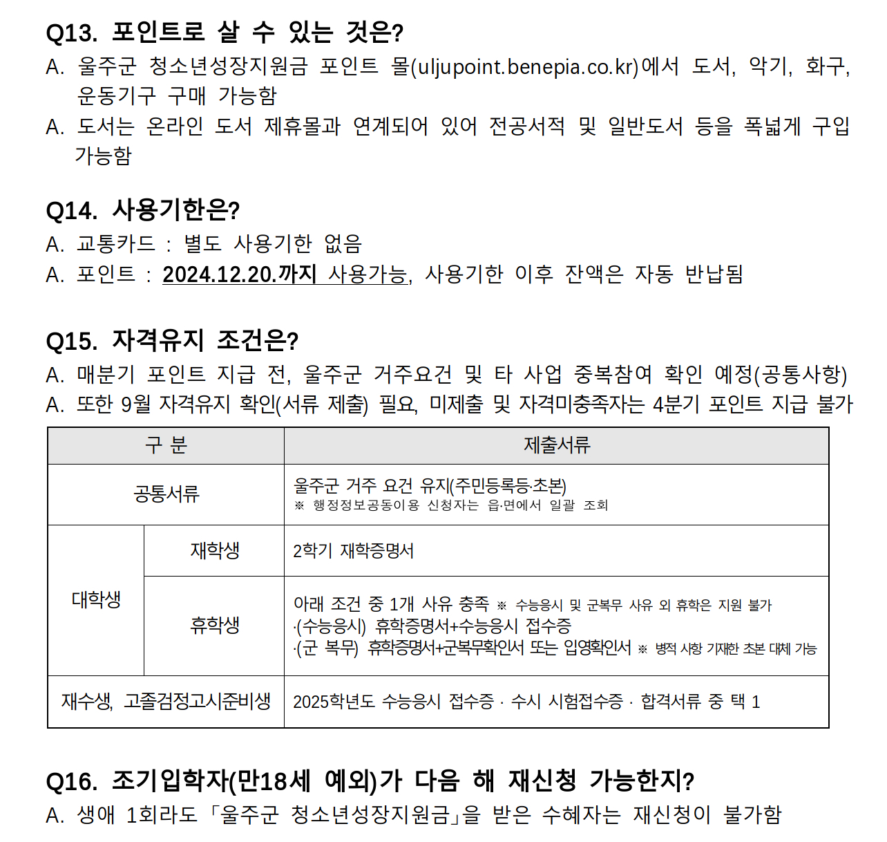 울주군 청소년 성장지원금 지원 대상은 신청서 제출일 기준 1년 이상 울주군에 주민등록을 둔 2005년 출생자 중 대학생, 대학 입학 예정 또는 대학 진학을 목표로 하는 청소년입니다.