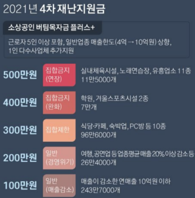코로나19 장기화로 피해를 입은 소기업과 소상공인에게 4차 재난지원금인 버팀목자금 플러스 지원이 시작됐다.이번 4차 재난지원금은 집합금지 또는 영업제한 규제를 받거나 매출이 감소한 소