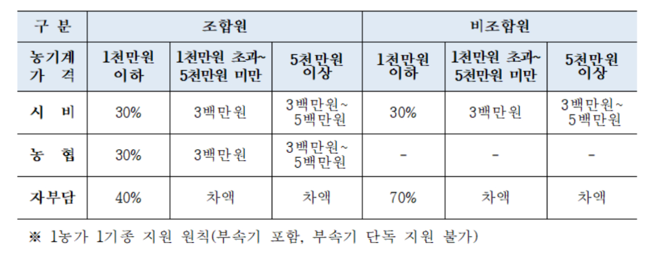 서울시 농업인 농기계 구입비 지원금은 서울시와 농협중앙회 서울본부가 절반씩 부담하기 때문에 조합원이 아닌 경우에는 서울시 지원금만 받을 수 있으며 농가당 1기종만(부속기 포함) 지원받을 수 있습니다.