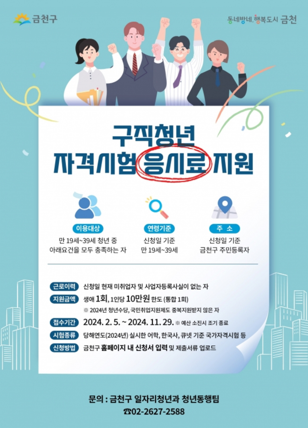 금천구 미취업 청년 자격시험 응시료 지원사업은 미취업 청년의 구직활동 경제적 부담완화 및 취업 능력을 개발하기 위한 활동의 지원을 위해 추진되는데 금천구는 2024년 올해 응시료 지원을 위해 예산 3천만 원을 편성했습니다.