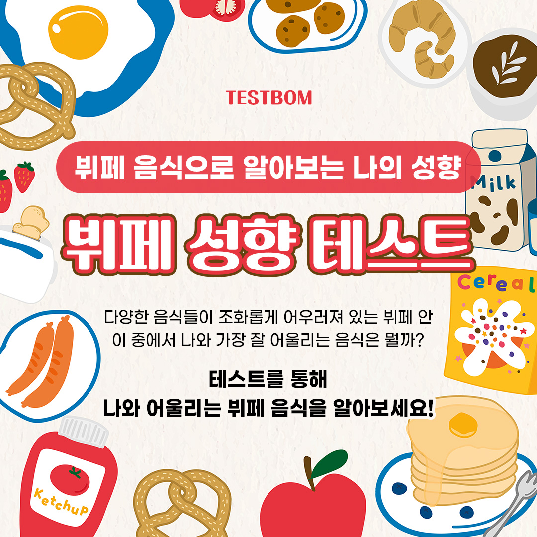 다양한 음식들이 조화롭게 어우러져 있는 뷔페 안 이 중에서 나와 가장 잘 어울리는 음식은 뭘까? 테스트를 통해 나와 어울리는 뷔패 음식을 알아볼 수 있는 테스트봄에서 나온 뷔페 성향 테스트를 소개드리겠습니다.