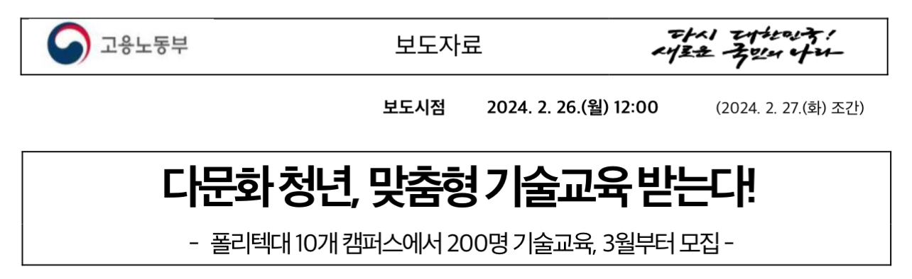 다문화 청년 맞춤형 기술교육 지원 신청방법에 대해서 정리하겠습니다. 고용노동부는 다문화가족 청년들의 성공적인 사회 진출을 위해 한국폴리텍대학(이하, ‘폴리텍대’) 10개 캠퍼스에 ‘다문화 청년 특화교육’을 신설하고 2024년 올해 200명을 대상으로 취업훈련을 실시한다고 밝혔습니다.
