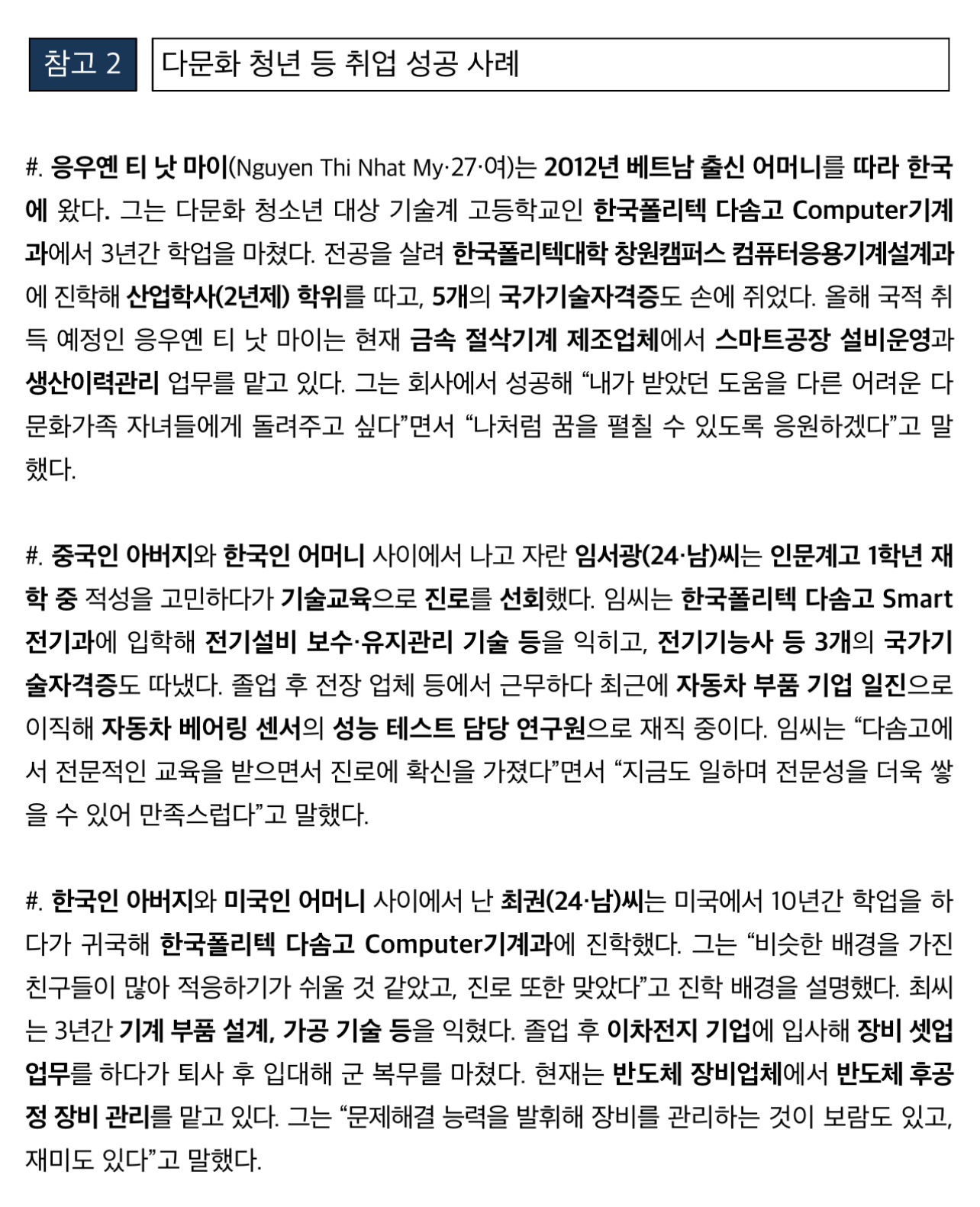 마지막으로 권태성 직업능력정책국장은 “최근 다문화가족이 증가하는 추세에 있어 이들이 한국 사회에서 안정적으로 정착할 수 있도록 지원이 필요하다”라고 강조하면서 “다문화가족 청년들이 잠재 역량을 발휘하고 미래 인재로 성장할 수 있도록 맞춤형 교육을 확대해 나가겠다”라고 말했다.