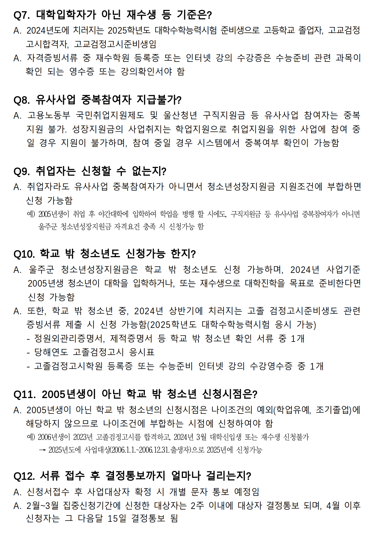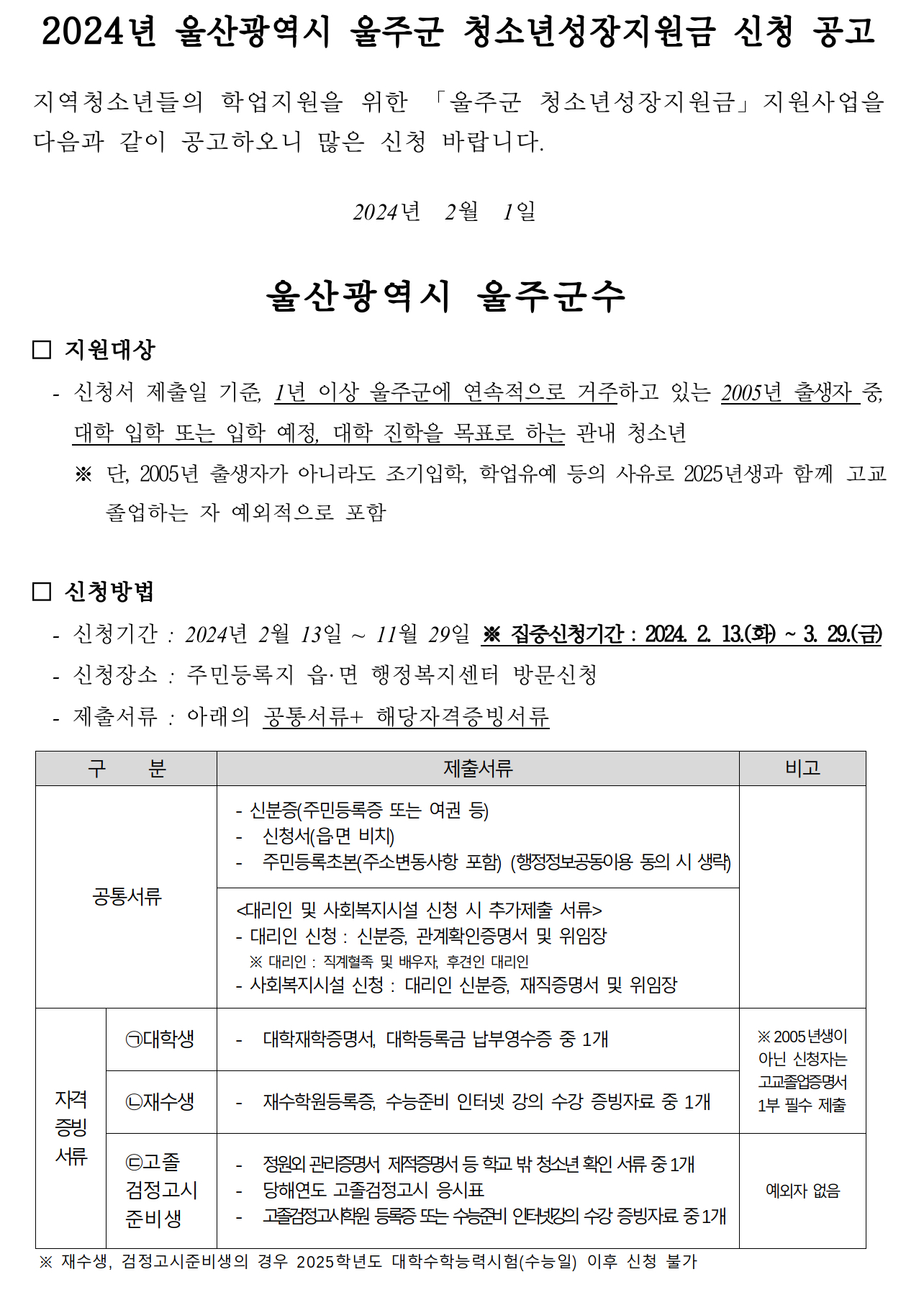 울주군 청소년 성장지원금 지원 대상은 신청서 제출일 기준 1년 이상 울주군에 주민등록을 둔 2005년 출생자 중 대학생, 대학 입학 예정 또는 대학 진학을 목표로 하는 청소년입니다.