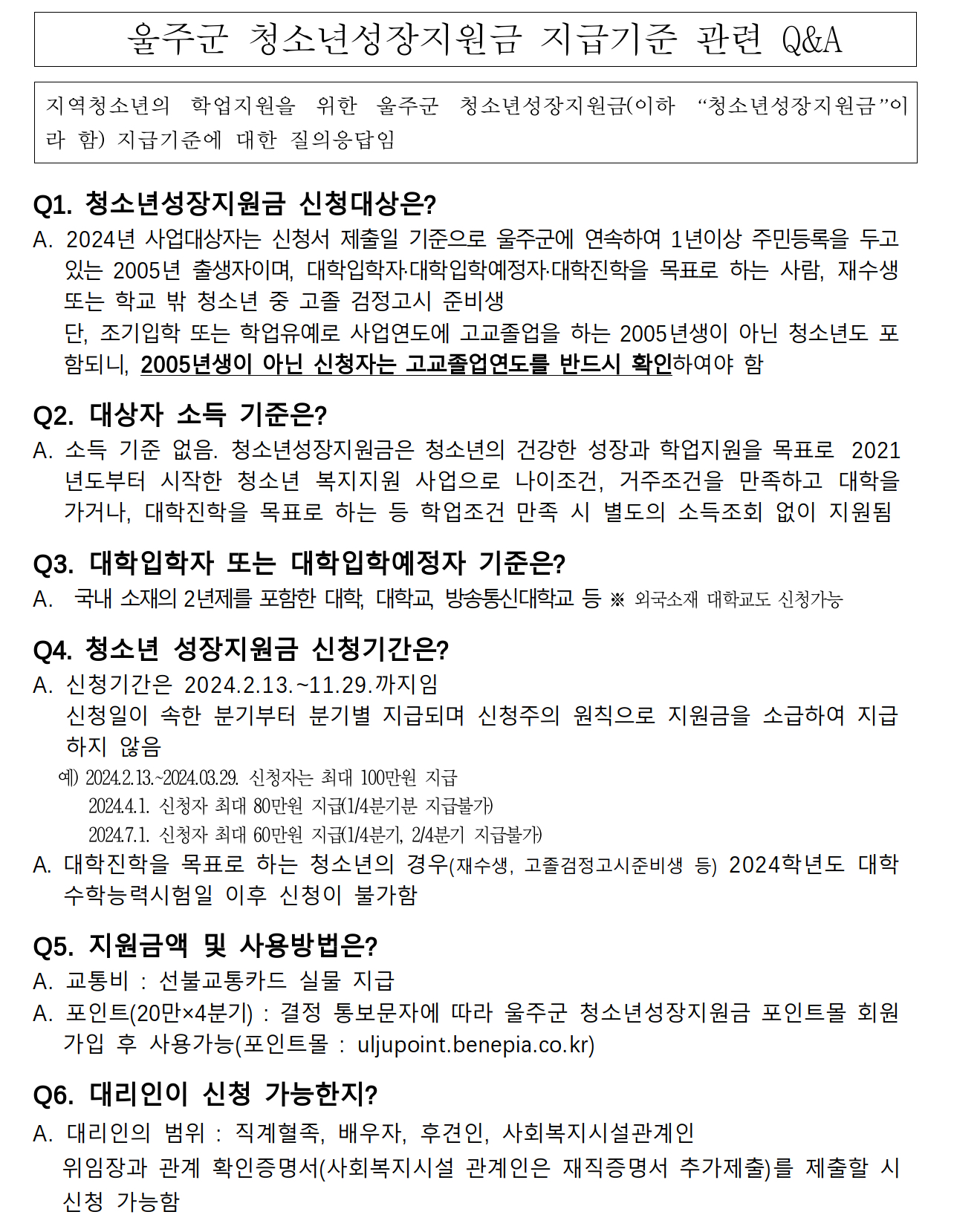 2024년 울주군 청소년 성장지원금 신청방법과 사용처에 대해서 정리하겠습니다. 울산시 울주군이 지역청소년의 건전한 성장과 학업 지원을 위해 ‘2024년 청소년성장지원금 지원사업’을 시행한다고 밝혔습니다.