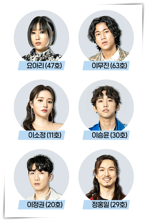 싱어게인 참가자는 11호, 20호, 29호, 30호, 47호, 63호 총 6명이 참가할 예정입니다.