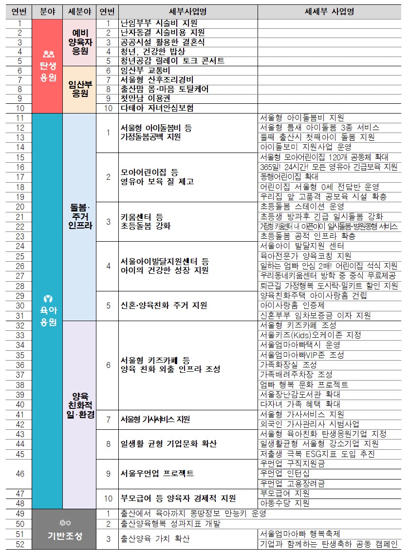 ‘탄생응원 서울 프로젝트’는 큰 틀에서 ▴아이 낳기 좋은 서울을 만들기 위한 ‘탄생응원’ ▴아이 키우기 좋은 서울을 만들기 위한 ‘육아응원’, 2개 분야로 구성되며 20개 핵심과제 52개 세부사업을 중점 추진한다고 합니다.