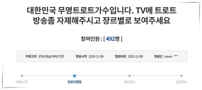 또한, 국민청원 게시판에 1명의 무명 트로트가수가 방송 자제하고 장르별로 보여달라는 청원서를 볼 수 있었습니다.