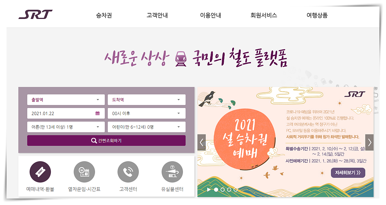 22일 오후 2시부터 28일 오후 1시까지 설 명절 SRT 승차권 전용 홈페이지를 운영할 예정입니다.