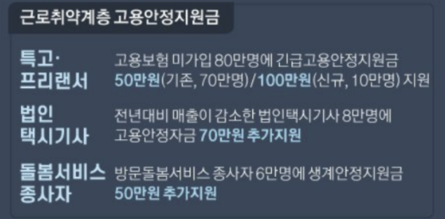 특고 및 프리랜서 대상자는 고용보험 미가입 80만명에게 50만원 또는 100만원을 지급할 예정입니다.
