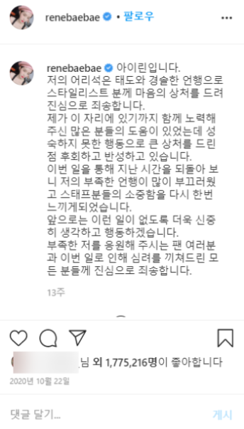 아이린 인스타 사과문 내용은 아래와 같습니다.
